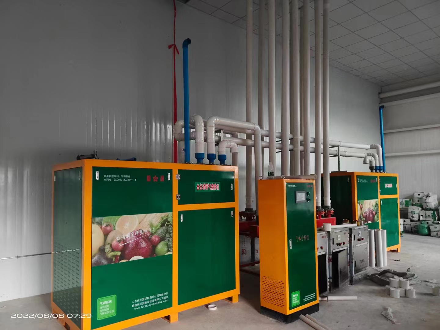 三、開(kāi)啟相應(yīng)需要降氧庫(kù)房的對(duì)應(yīng)閥門(mén),開(kāi)啟果蔬降氧機(jī),將氧氣降到要求值以下。